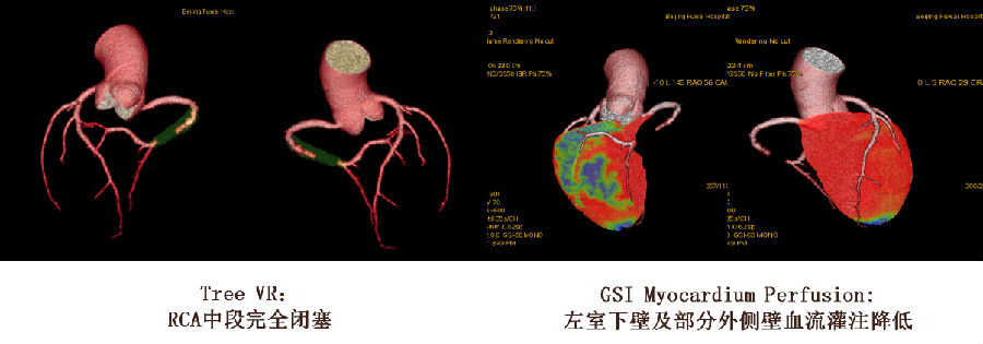 CT表现 右冠(RCA)中段完全闭塞 GSI Myocardium Perfusion:左室下壁及部分外侧壁血流灌注降低