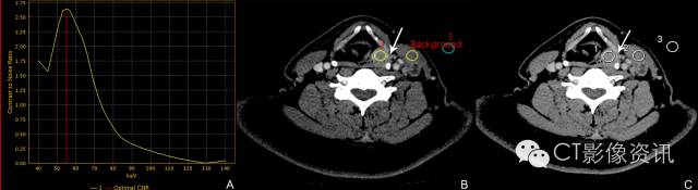 58岁男性 下咽癌患者,最佳CNR单能量55KeV是病变显示的最佳KeV。