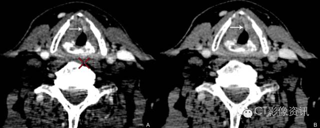 57岁男性 喉癌患者,单能图像较混合能量图像更清晰显示较小病变(左图为常规混合能量图像)。