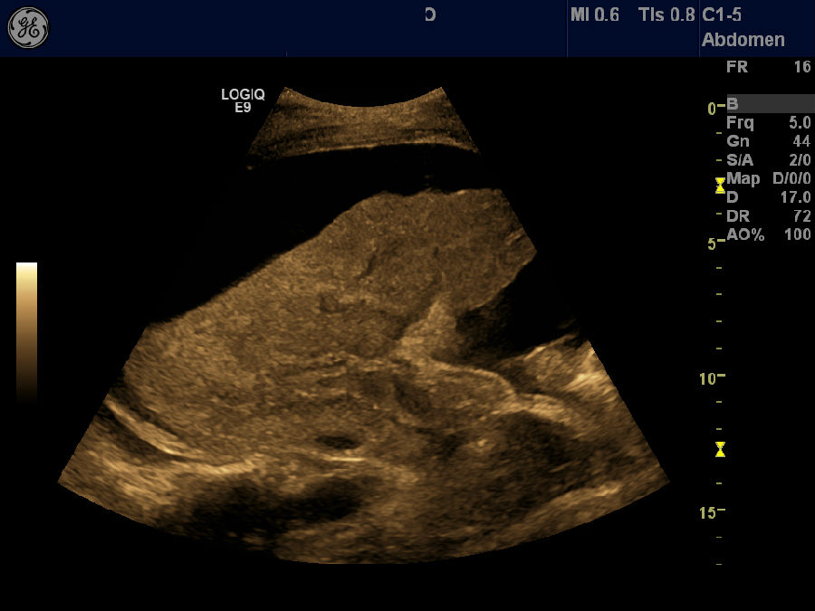 肋间斜切,彩色多普勒显示高回声的肝脏实性占位,肝癌,肝硬化,腹水,胸水