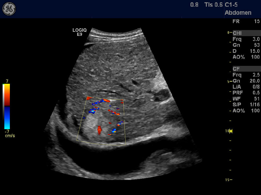 肋间斜切,彩色多普勒显示门静脉血栓,肝硬化,腹水