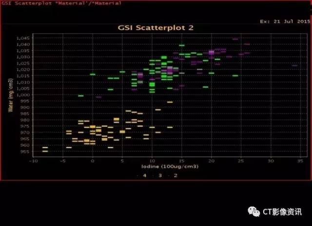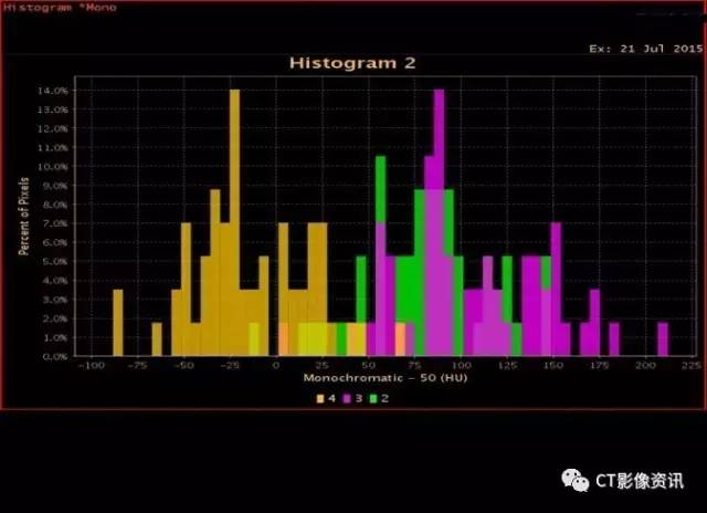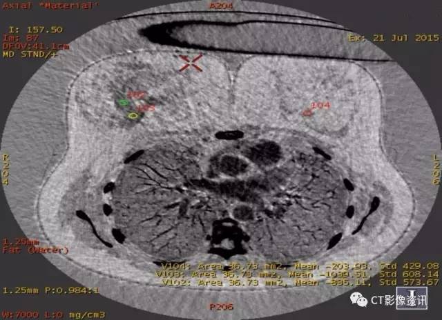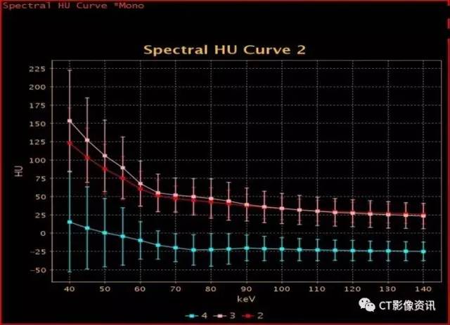低剂量能谱技术乳腺成像“初探” CT行胸部检查,兼顾乳腺组织,建议俯卧位乳腺下垂,双肘屈曲支撑,腹部垫枕头等支撑物。 低剂量能谱技术,在进行胸部检查的同时了解乳腺情况,有一定的临床意义。 乳腺软组织最佳成像单能量在40~50kev之间。 能谱曲线可以很好的区分正常腺体组织与病变组织,确定病变的范围。 正常乳腺组织主要由腺体与脂肪组成,“碘-脂肪”基物质配对,可以很好反应乳腺腺体、病变与脂肪之间的关系。