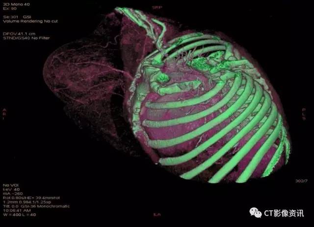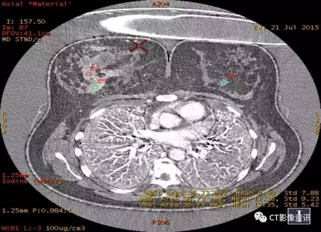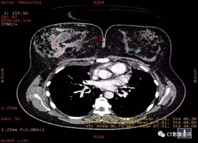 临床想了解患者发热情况,故申请行胸部CT增强扫描,强调一定要包括完整乳腺,乳腺情况也要了解。根据临床需求,了解胸部情况且兼顾乳腺组织,又要对软组织进行剂量保护,故采用GSI-36低剂量260mA能谱技术进行扫描。