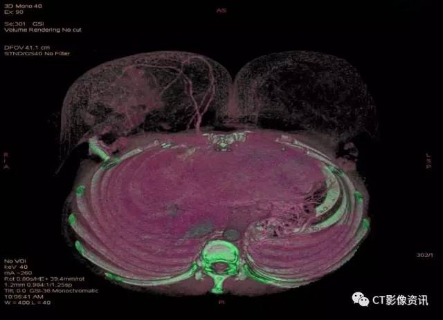 最佳单能乳腺软组织成像(此病例乳腺成像最佳单能在40-50kev之间)